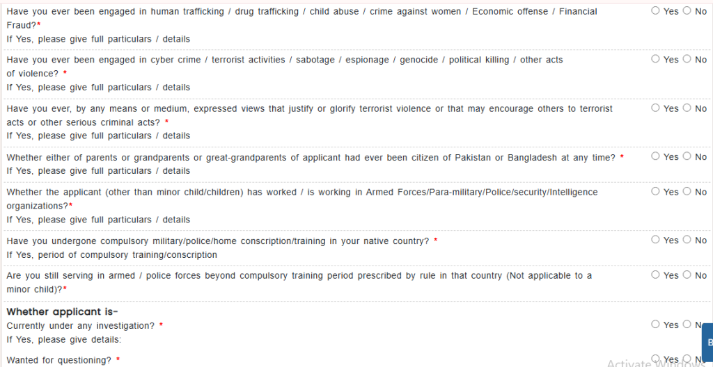 - Whether either of parents or grandparents or great-grandparents of applicant had ever been citizen of Pakistan or Bangladesh at any time? *